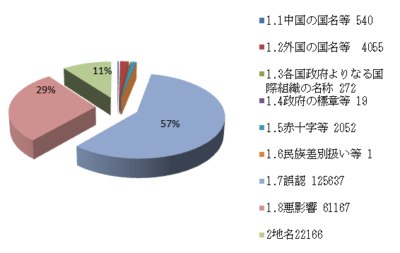 『商標法』第10条に係る拒絶査定不服審判審決における根拠条項(第10条第1項第1~8号および第10条第2項)比率は以下の通りである。そのうち、第10条第1項第7号に係る案件数は総件数の57%を占める125,637件で、他の条項に係る案件数を大きく上回り、第10条の中で最も適用頻度の高い規定となっている。