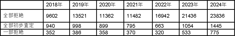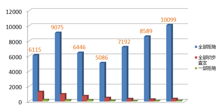 一方、第10条第1項第7号に係る拒絶査定不服審判の審決結果では、「全部拒絶」が最も多く、次いで「全部初歩査定」で、「一部拒絶」が最も少なかった。このデータから、第10条第1項第7号違反により拒絶された商標について、不服審判を申請しても、初歩査定を獲得する可能性は比較的低く、審査実務において、同条項に対する厳格な運用がなされていることが分かる。